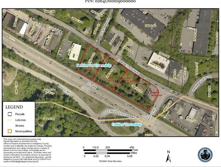 2.3 Acres M/L and 95,000 M/L Traffic Count for repurpose development located between and contiguous to both Interstate I-376 and Campbells Run Road at the I-376 Boyce Road Interchange with over 1,000' frontage access on both Campbells Run Road and Boyce Road. Immediate access to I-376 Boyce Road Interchange and minutes to I-376 Settlers Ridge Interchange and I-79 Interchange. Only 15-20 minutes to downtown Pittsburgh and Pittsburgh International Airport and 30 minutes to Interstates I-70 and I-76. Features four possible income producing properties. Tabletop flat ideal location and ideal for any business use.